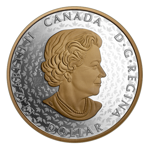 Your Peace Dollar’s reverse features selective yellow gold plating and a new field pattern behind the allegorical image of peace designed by retired RCM Senior Engraver Susan Taylor. Struck in Ultra High Relief (UHR), Lady Peace is depicted in profile with her hair crowned in a wreath of olive branches and maple leaves, which inspired the field pattern. She is flanked by her name “PAX” (the Latin word for “Peace”) and the year “2024”, while Canada’s national motto, “A MARI USQUE AD MARE” (“From sea to sea”) appears overhead. The obverse features selective yellow gold plating and the effigy of Queen Elizabeth II by Susanna Blunt. The obverse also bears a special marking that includes four pearls symbolizing the four effigies that have graced Canadian coins and the double date of her reign.