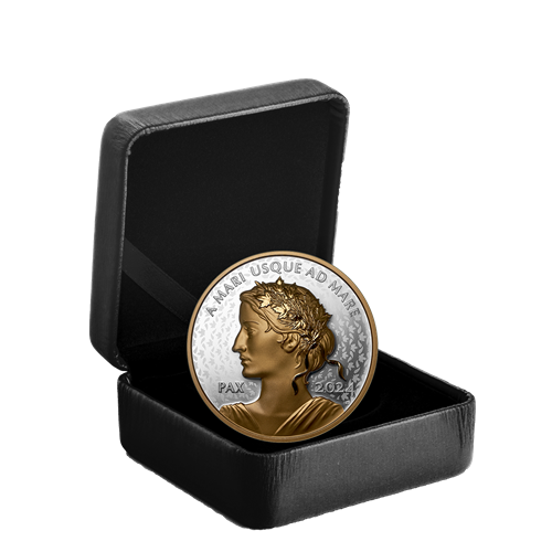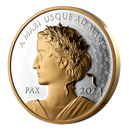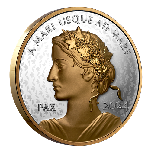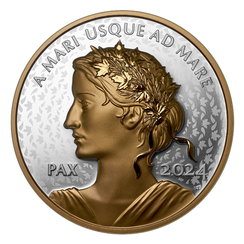 Each Peace Dollar is a powerful representation of Canada’s ongoing dedication to universal human rights and world peace, as is embodied in the allegorical figure that first appeared on the Peace and Liberty medal in 2019 and has since become a fixture on Canada’s annual Peace Dollar – and Lady Peace (“PAX”) is again featured on this 2024 edition. Plated with yellow gold, the Ultra High Relief (UHR) portrait radiates hope for a peaceful and prosperous future, while behind it, a new field pattern is inspired by Lady Peace’s crown of maple leaves and olive branches that, together, represent the core Canadian value of peace.