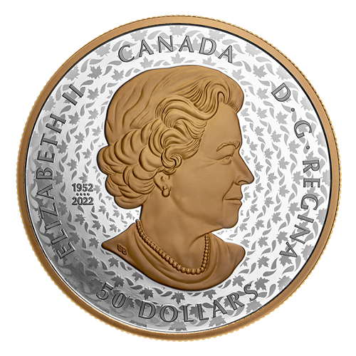 Your Peace Dollar’s reverse features selective yellow gold plating and a new maple leaf with ribbon pattern behind the allegorical image of peace designed by retired RCM Senior Engraver Susan Taylor. Struck in Ultra High Relief (UHR), Lady Peace is depicted in profile with her hair crowned in a wreath of olive branches and maple leaves, which inspired the field pattern. She is flanked by her name “PAX” (the Latin word for “Peace”) and the year “2024”, while Canada’s national motto, “A MARI USQUE AD MARE” (“From sea to sea”) appears overhead. The obverse features selective yellow gold plating and the effigy of Queen Elizabeth II by Susanna Blunt. The obverse also bears a special marking that includes four pearls symbolizing the four effigies that have graced Canadian coins and the double date of her reign.