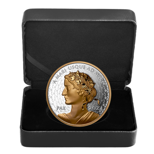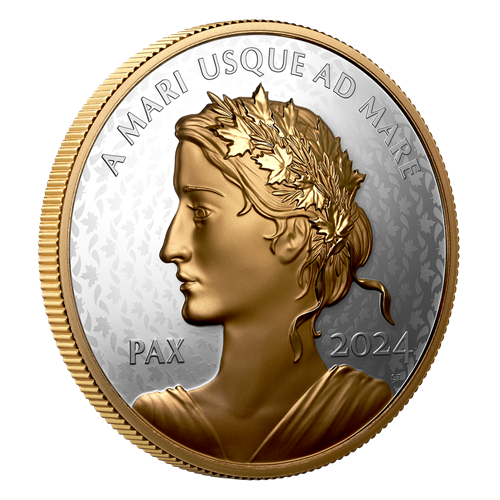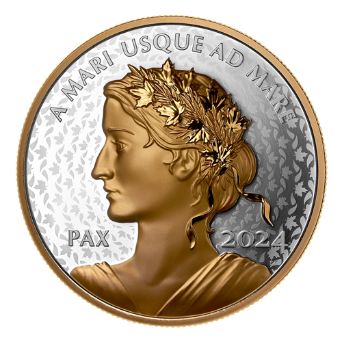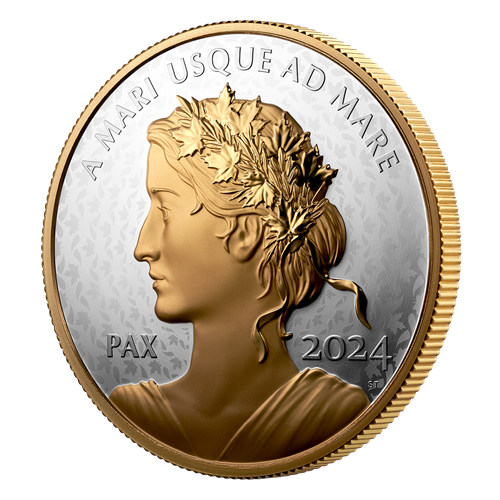 Each Peace Dollar is a powerful representation of Canada’s ongoing dedication to universal human rights and world peace, as is embodied in the allegorical figure that first appeared on the Peace and Liberty medal in 2019 and has since become a fixture on Canada’s annual Peace Dollar – and Lady Peace (“PAX”) is again featured on this 2024 edition. Plated with yellow gold, the Ultra High Relief (UHR) portrait radiates hope for a peaceful and prosperous future, while behind it, a new field pattern is inspired by Lady Peace’s crown of maple leaves and olive branches that, together, represent the core Canadian value of peace.