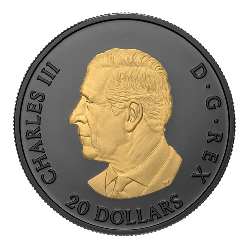 Designed by Canadian artist Donna Kriekle, your coin’s reverse features a gold-plated sugar maple (Acer saccharum) leaf set against the black rhodium plated field and rim. Black rhodium plating also fills the field and rim on the obverse, which features the gold-plated effigy of His Majesty King Charles III by Canadian artist Steven Rosati.
