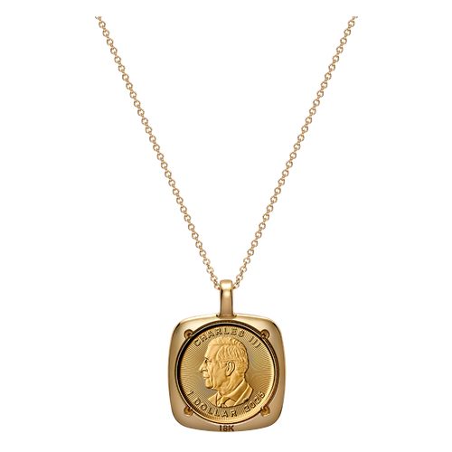 This statement piece consists of a Gold Maple Leaf (GML) bullion coin, a globally recognized investment piece, cradled in an 18K gold pendant and suspended from a matching 18K gold chain. The 24K gold coin features the classic GML bullion design by Walter Ott, with a single sugar maple (Acer saccharum) leaf backed by vivid radial lines, and with the effigy of His Majesty King Charles III by Steven Rosati on the obverse.