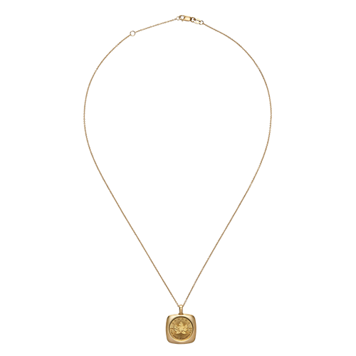 Revered for its exceptional purity, the 99.99% pure gold GML coin—here, in a 1/20 oz. size—gleams at the heart of the pendant, crafted with precision in Canada. Set in 18K gold and suspended from a matching chain, the GML is preserved in its original state, ensuring an unobstructed view of Walter Ott’s iconic maple leaf design in all its detail for all to admire.