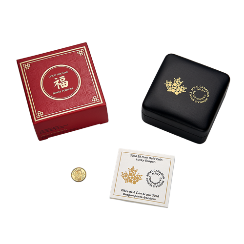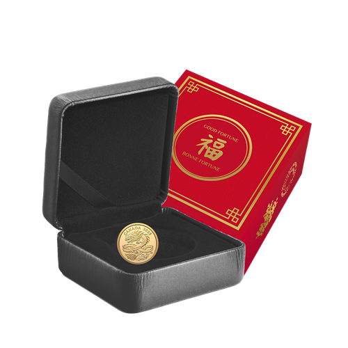 Your gold coin is presented in a Royal Canadian Mint-branded black clamshell and packaged in a red graphic beauty box, evoking the Chinese New Year “red envelope” tradition of bestowing a wish for luck and good fortune.