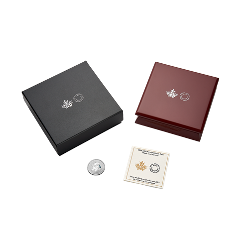 Your pure platinum coin is encapsulated and elegantly presented in a Royal Canadian Mint-branded wood case with a black beauty box.