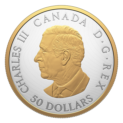 The reverse design by retired Royal Canadian Mint Senior Engraver Susan Taylor features a gold-plated, full-body portrait of Lady Peace, a personification of Peace (“PAX”). Inspired by the allegorical figure atop the National War Memorial in Ottawa, Lady Peace is dressed in a flowing robe and crowned with a wreath of maple leaves and olive branches expressing a core Canadian value of peace. Her serene countenance exudes poise, strength and quiet confidence as she extends her right arm, almost as if the peace wreath she holds is an offering to all. Lady Peace stands on the shoreline, which is similarly plated with yellow gold, and is supported by maple leaves that are symbolic of Canada. Canada’s motto, “A MARI USQUE AD MARE” (“From sea to sea”) appears in the sky above, where the sun’s rays break through the rain clouds and form the shape of a maple leaf. The rim on both sides of the coin is plated with yellow gold, while the obverse features the gold-plated effigy of His Majesty King Charles III by Canadian artist Steven Rosati.