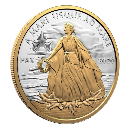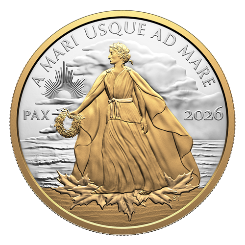 At the heart of Canada’s Peace Dollar stands a graceful personification of Peace that is poised, dignified, and, on the 2026 edition, highlighted by a contrasting precious metal.
