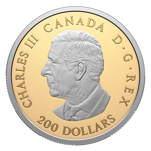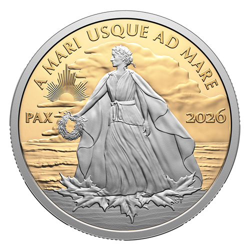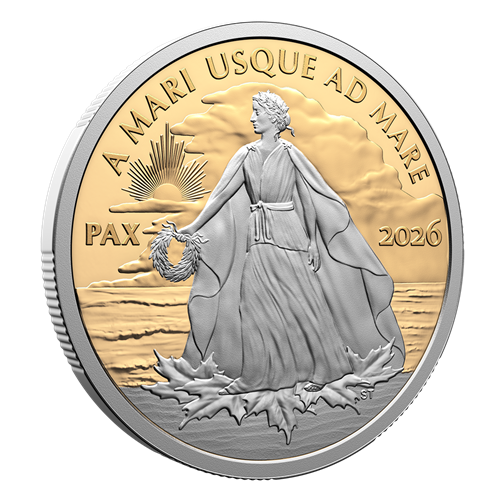 The reverse design by retired Royal Canadian Mint Senior Engraver Susan Taylor features a platinum-plated, full-body portrait of Lady Peace, a personification of Peace (“PAX”). Inspired by the allegorical figure atop the National War Memorial in Ottawa, Lady Peace is dressed in a flowing robe and crowned with a wreath of maple leaves and olive branches expressing a core Canadian value of peace. Her serene countenance exudes poise, strength and quiet confidence as she extends her right arm, almost as if the peace wreath she holds is an offering to all. Lady Peace stands on the shoreline, which is similarly plated with platinum, and is supported by maple leaves that are symbolic of Canada. Canada’s motto, “A MARI USQUE AD MARE” (“From sea to sea”) appears in the sky above, where the sun’s rays break through the rain clouds and form the shape of a maple leaf. The rim on both sides of the coin is plated with platinum, while the obverse features the platinum-plated effigy of His Majesty King Charles III by Canadian artist Steven Rosati.
