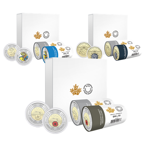 Every commemorative Special Wrap Roll issued this year. This collection covers Canada’s biggest commemorative themes in 2025 and delivers them directly to you. Six different versions of Canadian commemorative circulation coins will be issued this year—some are struck (non-colourized), some feature selective colour. Inside each of the presentation boxes, your two rolls come nestled in a custom foam insert alongside two encapsulated coins (one of each version)—a new addition that makes it easier for you to view the designs and put either side of the coin on display.