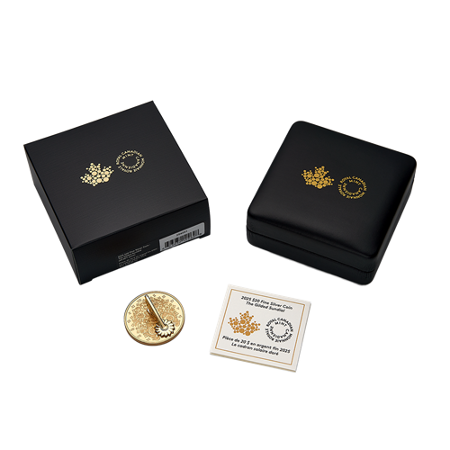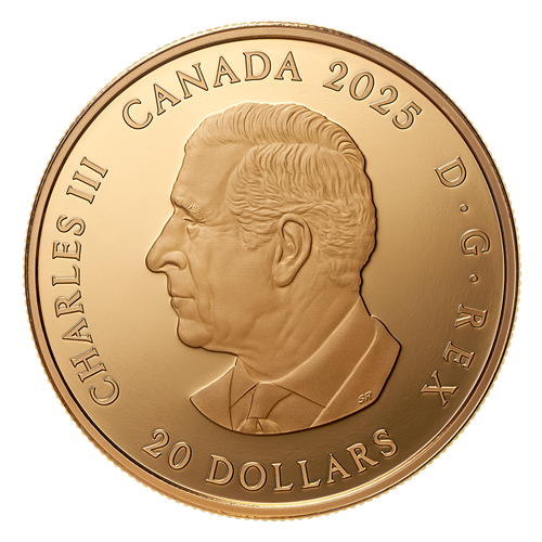 A functional sundial for mid-northern latitudes, your coin’s timekeeping reverse was designed by Canadian artist Anna Bucciarelli. Serving as the base, the reverse is ornamented with acanthus leaves and edged with Roman numerals indicating the hours from 6 a.m. to 6 p.m. At the bottom, a stylized sunflower—a heliotropic flower and a beloved symbol of the sun—supports the gnomon, which harnesses the power of sunlight and casts the measured shadow that helps determine the time of day. The obverse features the effigy of His Majesty King Charles III by Canadian artist Steven Rosati.