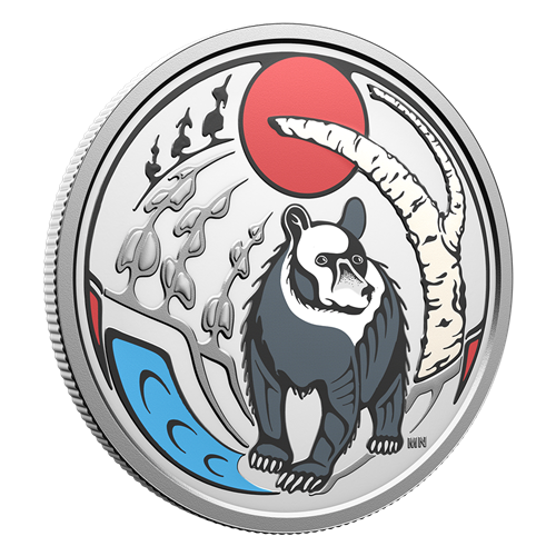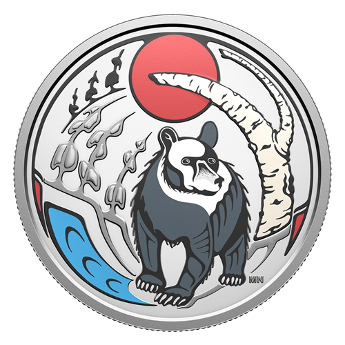 Designed by Anishinaabe artist Mark V. Nadjiwan, the coin’s reverse is set in a forest, where the red midday sun hangs high in the sky. Mukwa (the Bear) follows a blue forest stream, with black spruce rising up on one bank and a birch tree brightening the other. The obverse features the effigy of His Majesty King Charles III by Canadian artist Steven Rosati.