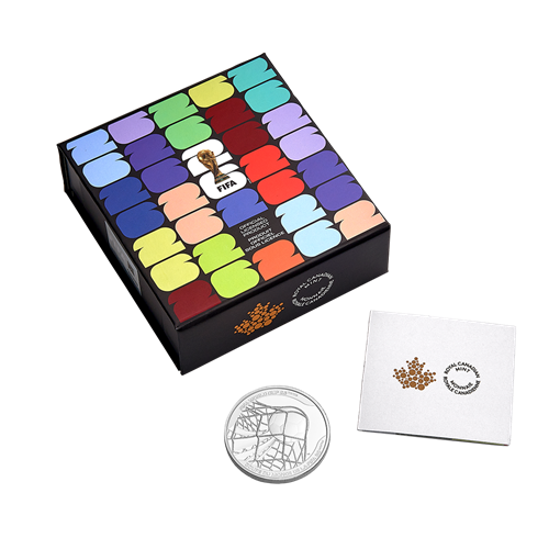 Your coin is encapsulated and presented in a graphic Royal Canadian Mint-branded paperboard box with an official FIFA authenticity label.