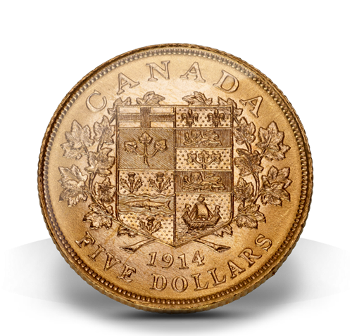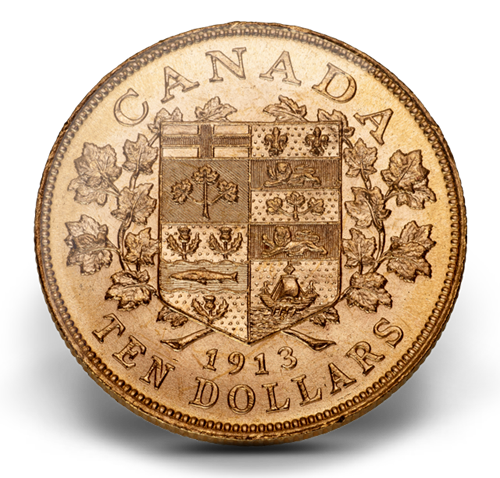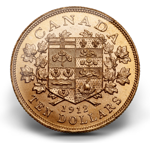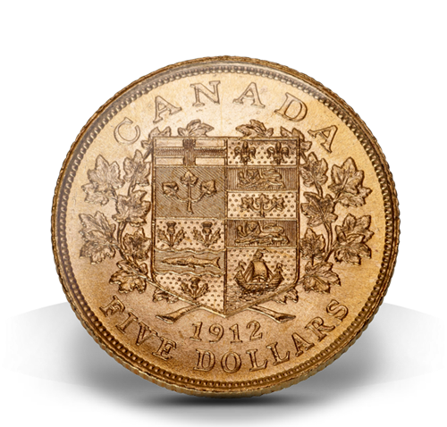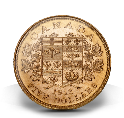 Le motif du revers représente les armoiries du Canada de l’époque, un écu constitué des emblèmes héraldiques des provinces du Dominion du Canada : l’Ontario, le Québec, laNouvelle-Écosse et le Nouveau-Brunswick.L’écu est encerclé de magnifiques rameaux d’érable. Au-dessus est gravée l’inscription « CANADA », et au dessous figurent le millésime « 1912 », « 1913 » ou « 1914 » et, en anglais, la valeur nominale « FIVE DOLLARS » ou « TEN DOLLARS ». L’avers des pièces est à l’effigiedu roi George V. Un grènetis souligne lepourtour des deux côtés de la pièce.