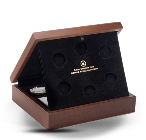 • Placées dans des capsules assorties de sceaux holographiques dorés, les pièces sont présentées dans un coffret en bois d’érable exclusif qui met en valeur les six pièces de qualité supérieure.Le coffret est également accompagné d'un certificat d’authenticité, ainsi que d’un sac de tissu dans lequel se trouvaient les pièces conservées dans les chambres fortes de la Banque du Canada et d'une étiquetted’identification authentique. Le coffret est protégé par un élégant emballage noire.