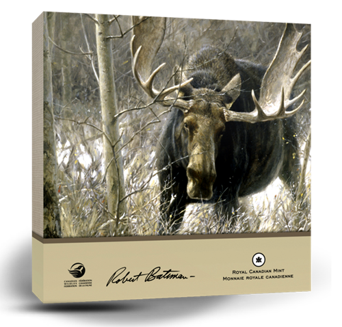Surtout connu pour ses superbes tableaux réalistes qui reflètent l’âme de la faune canadienne, Robert Bateman cumule plus de 50 années de carrière et traduit depuis sa tendre enfance sa passion des animaux sauvages dans des toiles au réalisme confondant qui dépeignent la splendeur de la faune canadienne.Au nombre des tableaux les plus connus de Robert Bateman figurent ses toiles portant sur le thème de l’orignal. Lemotif de la pièce, qui représente un orignal mâle baissant la tête surmontée de ses bois en position d’affrontement, est tiré du tableau The Challenge de Robert Bateman.