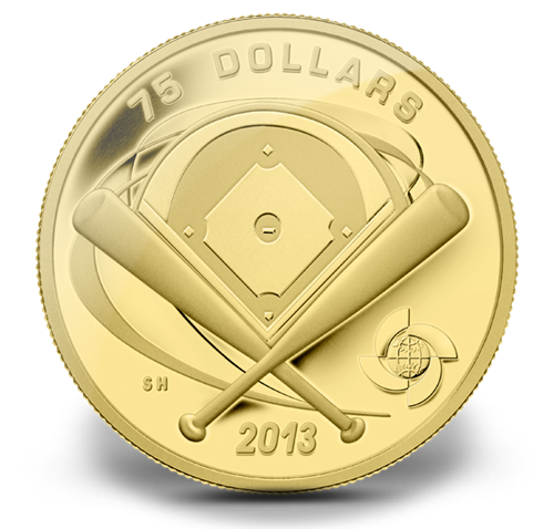 Conçu par l'artiste canadien Steve Hepburn, lemotif au revers représente un champ intérieur stylisé, dont les quatre buts et le monticule du lanceur sont marqués par des symboles classiques. Au bas du champ intérieur sont superposés deux bâtons de baseball entrecroisés. L'image entière se superpose à une forme en spirale symbolisant la vitesse, l'adresse et l'attrait universel de l'événement d'envergure internationale. Du côté droitdu champ apparaît le logo officiel du tournoi de laWorld Baseball Classic. En arrière-plan, sur la surface en or poli du revers de lapièce, figurent les mentions « 75 DOLLARS » et « 2013 ».