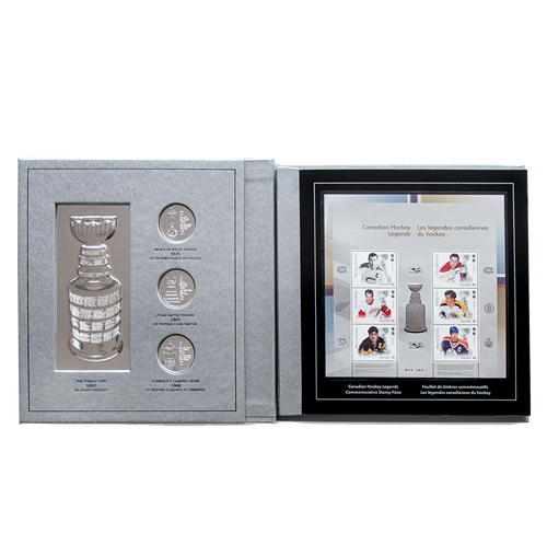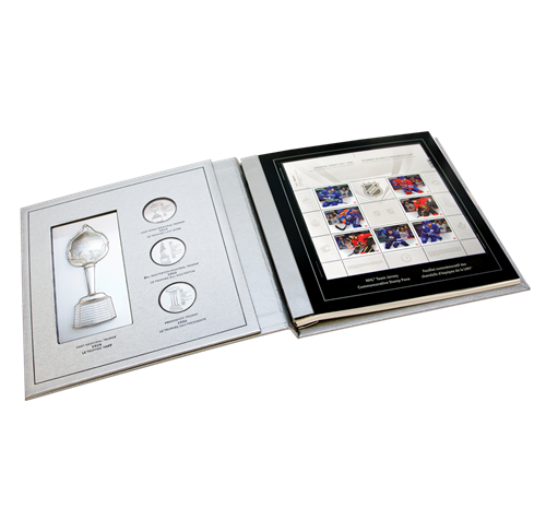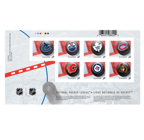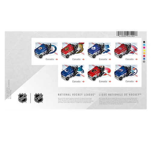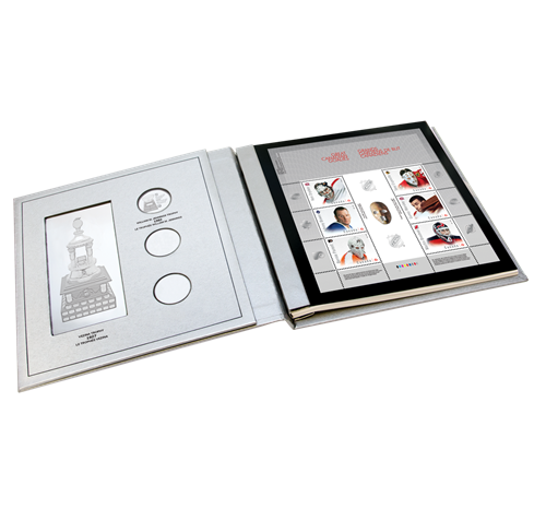 - Un feuillet spécial composé des timbres commémoratifs représentant les chandails des équipes de hockey.