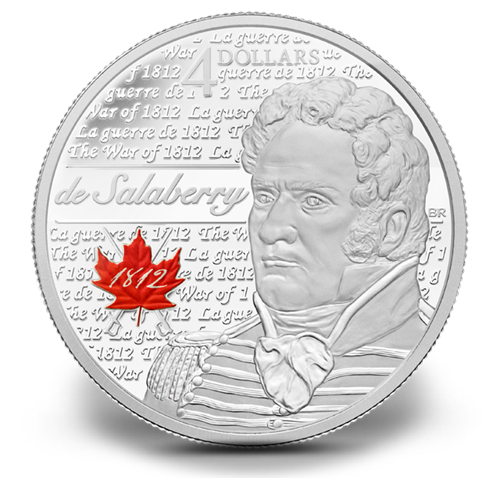 Conçu par Bonnie Ross, le motif de cette pièce arbore à l’avant-plan le portrait de trois-quarts de Charles-Michel de Salaberry sur champ orné d’un motif minutieusement sculpté et sur lequel est gravée l’inscription bilingue « The War of 1812/La guerre de 1812 ». Le centre du champ est traversé horizontalement par une bande polie où est inscrit le nom « de Salaberry » en caractères cursifs. Sous cette bande figure le logo de la guerre de 1812 du gouvernement du Canada, gravé et peint : la date 1812 estinscrite à l’ancienne et contenue dans une feuille d’érable rouge stylisée derrière laquelle des épées se croisent. La valeur nominale « 4 DOLLARS » est également gravée en relief au revers.
