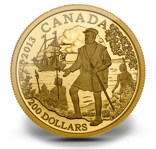 Le motif de la pièce, conçu par l'artiste canadienne Laurie McGaw, représente un portrait en pied de trois quarts de Jacques Cartier, accompagné de soldats français et d'un guide amérindien, debout sur la rive observant cette nouvelle terre, le « Canada ». En relief figurent la mention « CANADA », le millésime « 2013 » et la valeur nominale« 200 DOLLARS ».