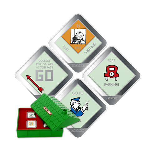 « Passez GO! » et obtenez un ensemble officiel de quatre pièces de 1/4 oz en argentde MONOPOLY émis par la New Zealand Mint et accompagné d'un étui de présentation MONOPOLY conçu sur mesure! Procurez-vous l'ensemble complet de quatre pièces ayant cours légal. En argent pur à