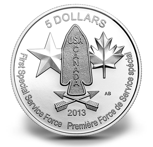 Le motif de la pièce représente une étoile et une feuille d'érable stylisées sur lesquelles se superpose l'insigne de la Première Force de Service spécial que portaient à l'épaule les soldats canadiens et américains participant à des missions communes. Sur l'insigne figure les noms des deux pays. Sous l'image centrale est illustrée une forme en pointe de flèche qui symboliserait l’esprit guerrier de la PFSS. Au revers figurent également la mention « FIRST SPECIAL SERVICE FORCE » et « PREMIÈRE FORCE DE SERVICE SPÉCIAL », le millésime « 2013 » ainsi que la valeur nominale « 5 DOLLARS ».