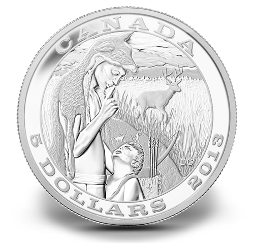 Le motif de la pièce, créé par l’artiste amérindienne du peuple salish du littoral Darlene Gait, raconte l’histoire captivante de la partie de chasse initiatique d’un garçon. Son visage exprime une impatience évidente que son père, camouflé, tentede calmer en appelant le silence le doigt contre labouche. Un cerf figure en arrière-plan parmi de longues herbes, et, sur la pierre derrière le garçon, on aperçoit le pétroglyphe d’une scène de chasse.