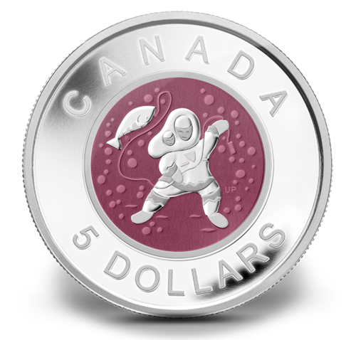 Le motif du revers est l’œuvre de l’artiste inuite Ulaayu Pilurtuut. Il représente une mère à la pêche, tout heureuse de sa dernière prise, avec son bébé blotti dans son amautik. Fidèle au style de l’art inuit contemporain, le motif rend bien l’humour et la joyeuse insouciance qu’on associe volontiers à cette culture millénaire.