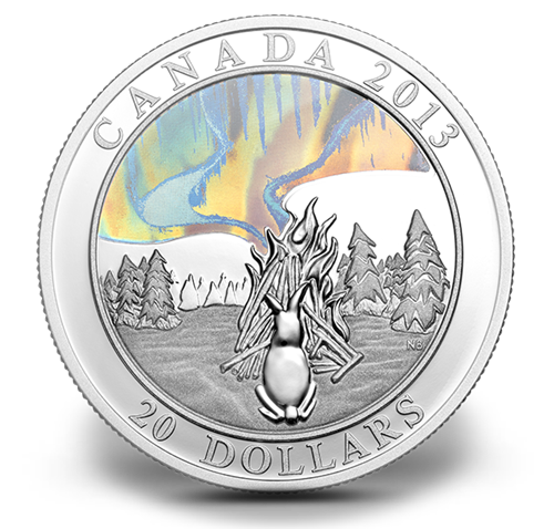 Œuvre de l’artiste métisse canadienne Nathalie Bertin, illustre la légende odawa de Nanahboozho assis près de son feu qui donne naissance aux aurores boréales. Les aurores colorées sont mises en valeur par un hologramme à la forme unique qui reproduit leur mouvement dans le ciel nocturne. Le revers présente également en relief la mention « CANADA », le millésime « 2013 » et la valeur nominale « 20 DOLLARS ».