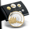 • Ensemble épreuve numismatique seulement : la pièce de 1 $ et le disque central de la pièce de 2 $ sont plaqués oret le motif du dollar épreuve numismatique est rehaussé d’un placage d’or sélectif.