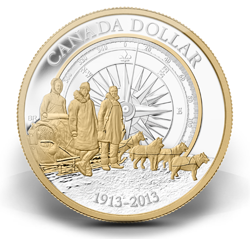 Conçu par l'artiste canadienne Bonnie Ross, le motif du dollar épreuve numismatique en argent fin est tiré d'une photographie prise lors del'Expédition canadienne dans l'Arctique. Il représente trois hommes à bord d'un traîneaudont les chiens d'attelage attendent le commandement avant de se lancer à l'assaut de la toundra arctique. Derrière cette scène apparaît l'image stylisée d'une boussole à l'horizon.