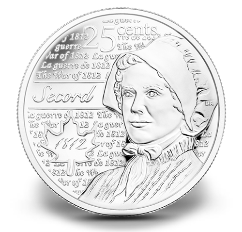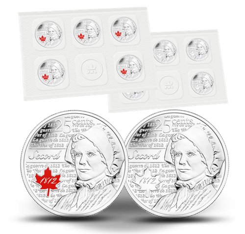 • Cinq des pièces sont ornées d’une gravure peinte représentant le logo de la guerre de 1812 du gouvernement du Canada, tandis que les cinq autres pièces, non colorées, mettent en valeur le profil de Laura Secord avec un fini givré.