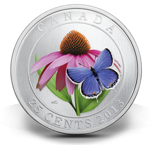 Conçu par l’artiste canadien Maurice Gervais, le superbe motif représente une fleur d’échinacée pourpre gravée et peinte. Le centre de la fleur est composé defleurons tubulaires rouge-orangé entouré de pétalesd’un pourpre éclatant qui se dressent sur une tige verte réaliste ornée de deux feuilles lisses. Un bleu porte-queue de l’Est est posé sur la partie inférieure droite des pétales de la fleur, ses ailes teintées de bleu foncé rendues dans les moindres détails avec leur contour noir et blanc distinctif et leurs taches orange à la base de chaque aile postérieure. Le revers présente également la mention « CANADA », le millésime « 2013 » et la valeur nominale « 25 CENTS ».