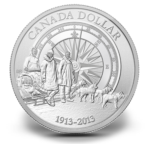 Conçu par l'artiste canadienne Bonnie Ross, le motif de la pièce de un dollar de qualité spécimen dépeint plusieurs éléments importants de l'Expédition canadienne dans l'Arctique. À l'avant-plan, l'image est tirée de l'abondante collection de photographies prises lors de l'Expédition pour représenter trois hommes se tenant près d'un traîneau à chiens rempli d'équipement. Attelés au traîneau et immobiles, les chiens attendent l'ordre de partir pour se lancer dans la toundra arctique. À l'arrière-plan, loin au-dessus de l'horizon où se découpent les montagnes, est représentée l'image stylisée d'une boussole pointant à 10 degrés àl'est du nord géographique.