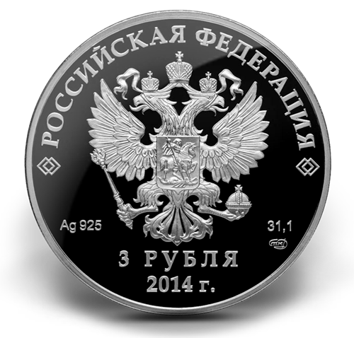 Conçue par A.A. Brynza, la pièce représente unskieur alpin qui dévale une pente, en recherche de vitesse. La pièce comprend aussi le détail en couleur d'un magnolia, un arbre qu'on trouve surla côte méridionale de la Crimée et qui est abondamment utilisé pour décorer les villes de la région. Œuvre de l'artiste E.V. Kramskaia, l'avers de la pièce présente une image en relief des armoiries de l'État de la Fédération de Russie, surmontées d'une inscription en demi-cercle, « LA FÉDÉRATION DE RUSSIE ». L'avers présente également la valeur nominale de la pièce « TROIS ROUBLES »,l'année d'émission « 2014 r. », le nom dumétal selon le tableau périodique des éléments de D.I. Mendeleyev, la pureté, la marque d'atelier de la Monnaie de Saint Pétersbourg et la teneur en métal précieux.