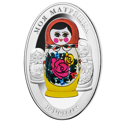 De forme ovale singulière, la pièce est rehaussée d'un fini épreuve numismatique de la plus haute qualité. Le motif au revers représente une jolie matriochka colorée et, à sescôtés, deux plus petites poupées russes traditionnelles.