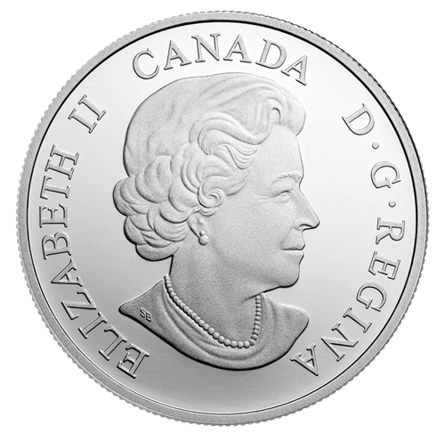 Le motif représente le profil d’un mammouthlaineux, dont la précision scientifiquea été vérifiée par les paléontologues du Royal Tyrrell Museum of Paleontology. La tête relevée et la trompe déployée entre ses célèbres défenses longues et recourbées,le mammouth arbore ici un pelage plus court par rapport à la fourrure dense qui lui permettait de survivre aux températures glaciales de l’hiver. Selon les scientifiques, lamue se produisait en début d’été. On voit bien la bosse de graisse entre ses épaules et, à l’arrière-plan, les herbes rases des vallons, caractéristiques de l’habitat du mammouth, qui débordent de part et d’autre sur l’anneau extérieur de la pièce.