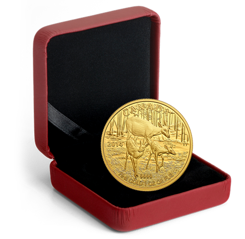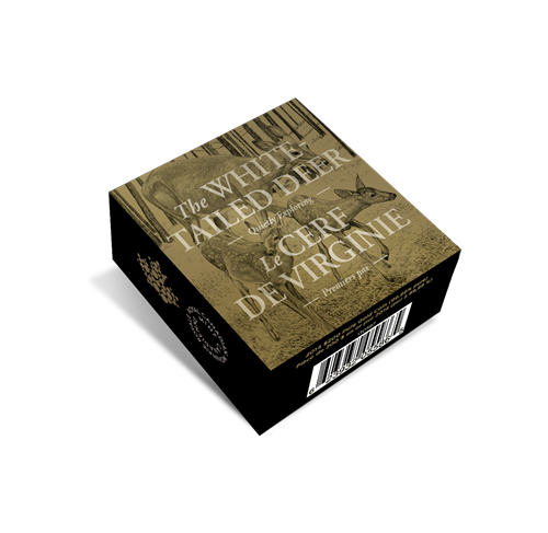• Cette pièce de luxe en or pur fait partie de la série de six pièces consacrée au cerf de Virginie et s'inscrit dans la foulée despopulaires séries sur la faune de la Monnaie royale canadienne, la première lancée en 2013 (pygargue à tête blanche), la seconde en 2014 (bison).