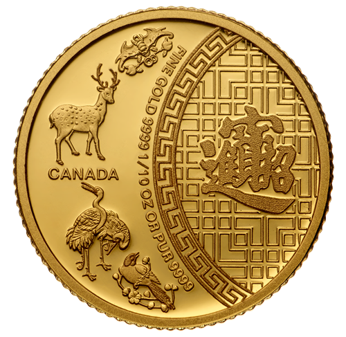 • Cette pièce épreuve numismatique de 1/10 once en or pur à 99,99 % est ornée d'un superbe motif gravé qui confère des vœux de bonheur, de succès, de longévité, de joie et de bonne fortune à son propriétaire.