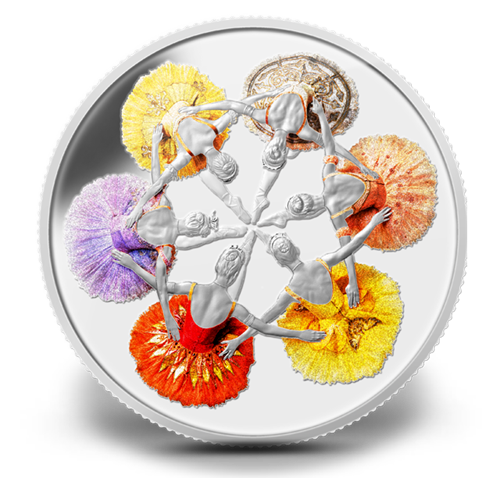 • UNE PREMIÈRE! Une exclusivité de la Monnaie royale canadienne : cette pièce a été conçueà l’aide d’une technique de coloration de pointe produisant un effet de transparence. Utilisée pour la première fois en 2014, cette innovation, qui donne un aspect chatoyant aux couleurs, permet de recréer avec fidélité la complexité des costumes pastel portés par les ballerines du Royal Winnipeg Ballet dans une flamboyante production de La Belle au bois dormant.