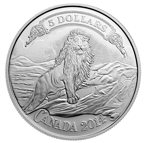 Le revers de cette pièce en argent pur à 99,99 % reproduit un saisissant portrait de lion emprunté à une vignette de la British American Banknote Company datant du début du XXe siècle. Les graveurs de la Monnaie royale canadienne ontredonné vie au « roi de la jungle » en reprenant avec une extrême minutie la gravure au trait caractéristique des anciens billets de banque. S’inspirant de la technique magistrale de l’œuvre originale, ils ontsu rendre dans l’argent fin la courbe dechaque muscle, le dessin de chaque mèchede poils, les ombres de l’animal et de son spectaculaire décor de montagne ainsique les moindres détails de la banderoleet du lettrage.
