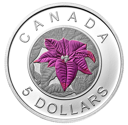 Le motif au revers représente un poinsettia qui ressort d'un champ de fleurs écloses grâce à un procédé de coloration sélective – un vibrant hommage à cettefleur étoilée qui égaie les célébrations des Fêtes chaque année partout au Canada. Le motif est également rehaussé d'un disque en niobium oxydé qui donne à la pièce un aspectspectaculaire et singulier.