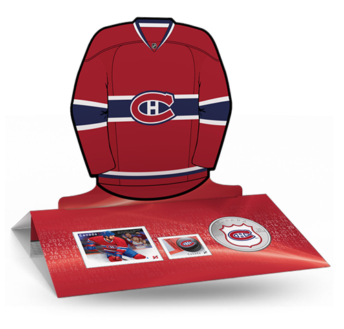 • Une première : un ensemble d'une pièce et de deux timbres commémoratifs sur les Canadiens de Montréal dans un emballage qui intègre un chandail de l'équipe en 3D!