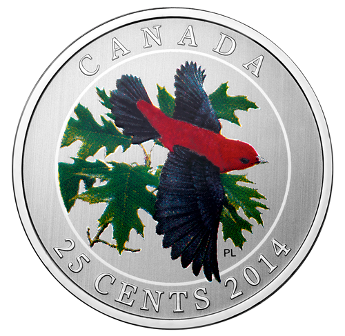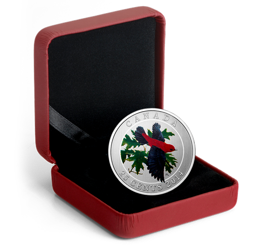 • Quatorzièmeet dernière pièce de la renommée série Oiseaux du Canada dela Monnaie royale canadienne. Cette pièce colorée illustre minutieusement les couleurs splendides et le détail des plumesde l'insaisissable piranga écarlate.