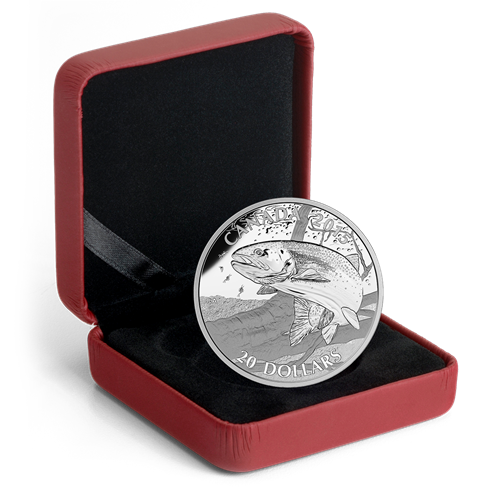 • Il s’agit de la dernière émission de la série de quatre pièces que la Monnaie royale canadienne consacre aux poissons-gibiers. Son motif richement détaillé représente l’un des poissons-gibiers les plus prisés d’Amérique du Nord : la truite arc-en-ciel.