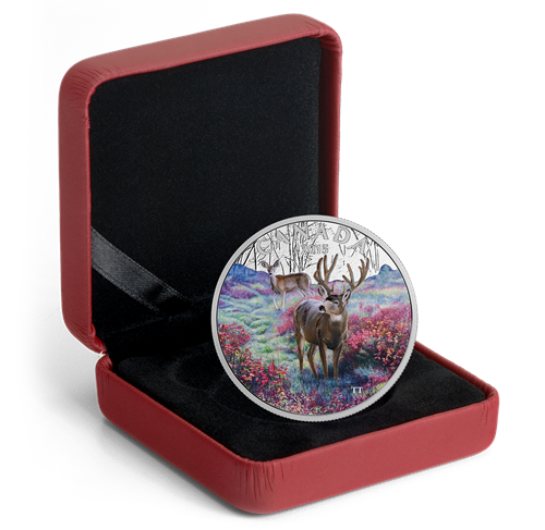 La vue d’un magnifique cerf mulet (Odocoileus hemionus) qui broute sur le bord d’une route ou dans un pré constitue une expérience mémorable pour les amoureux de la nature et des animaux. D’une rare beauté, ce cerf auport majestueux doit son nom à ses grandes oreilles qui ressemblent à celles d’un mulet. LaMonnaie royale canadienne consacre cette ravissantepièce en argent à un animal remarquable, dont la présence ajoute au charme prodigieux des grands espaces canadiens.