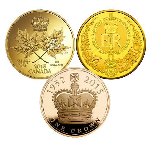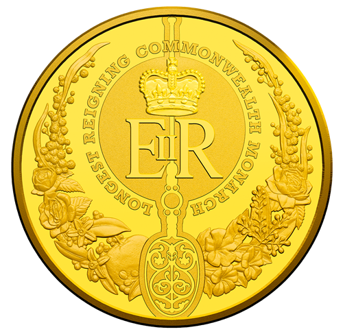 Cet ensemble de trois pièces en or souligne le règne historique de Sa Majesté la reine. Faitinusité, les motifs au revers et à l'avers de la pièce de 5 £ de la Royal Mint ont été créés par un seul et même artiste, James Butler, un membre de la Royal Academy. La Monnaie royale canadienne a frappé une pièce de 200 $ créée par l'artiste Cathy Bursey-Sabourin pour commémorer ce moment historique, et une pièce de 100 $ créée par l'artiste Bronwyn King de la Royal Australian Mint vient compléter l'ensemble. Les trois pièces sont rehaussées d'un fini épreuve numismatique. Leur manipulation est déconseillée afin de conserver ce fini.