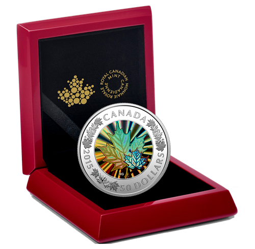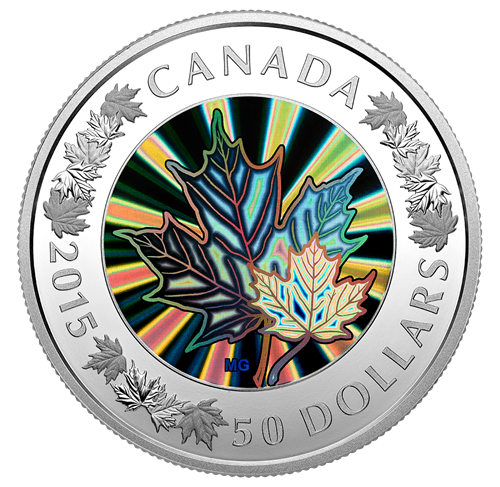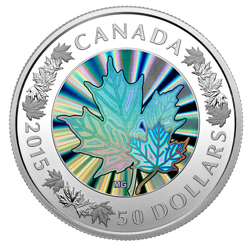 L'artiste canadienne Michelle Grant a créé une pièce sensationnelle qui met en vedette la feuille d'érable, symbole national par excellence du Canada. Deux feuilles holographiques brillent au centre du champ, chatoyant de couleurs variées sous les reflets dorés de la lumière du soleil. Dans la bordure, des feuilles d'érable forment un anneau avec la mention « CANADA », le millésime « 2015 » et la valeur nominale « 50 DOLLARS ».