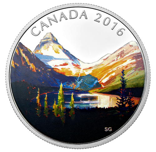 Le motif au revers, œuvre de l'artiste canadienne Stéphanie Gauvin,est une reproduction artistique du lac Magog, situé dans le parc provincial du mont Assiniboine. Jouant sur la lumière et les ombresprojetées par le soleil matinal, l'artiste a su rendre par ses coups de pinceau les nombreux contrastes du paysage, lesquels ont été reproduits dans cette gravure finement détaillée. En arrière-plan, la célèbre silhouette pyramidale du mont Assiniboine surplombe le lac et les glaciers, son altitude imposante rendue évidente par l'espace qu'il occupe dans la partie supérieure du motif. À sa base, tel un miroir, le lac scintille dans la lumière de l'aube, entouré de la vallée et des arbres. Le regard de l'observateur s'y pose, attiré par l'ajout de couleurs naturels qui offrent une reprodcution de la lumière. Cette coloration naturel donne au lac son bleu vibrant, tandis que le vert des arbres, en arrière-plan, ajoute de la dimension et de l'éclat au motif.