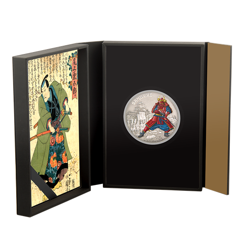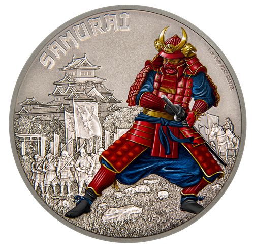 La pièce présente l'illustration colorée d'un samouraï en armure complète; à l'arrière-plan, des soldats samouraïs sont alignés, prêts à combattre.