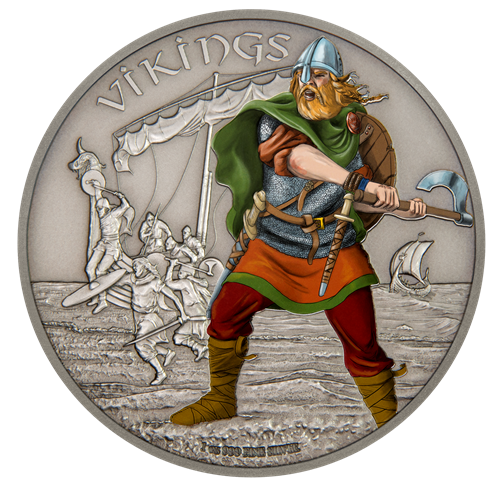 La pièce présente l'illustration colorée d'un guerrier viking en tenue de combat, avec derrière lui d'autres guerriers et leurs drakkars.